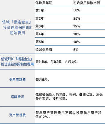 以下是信诚「福连金生」投资连结保险B款产品组合在保单运作过程中需收取的各项费用。