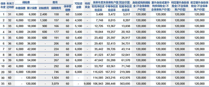 5、本产品不收取退保费用,保单年度末的现金价值等于上表中的保单年度末保单账户值,若退保发生在保单年度其他时点,则现金价值需相应调整为退保当时的保单账户值。